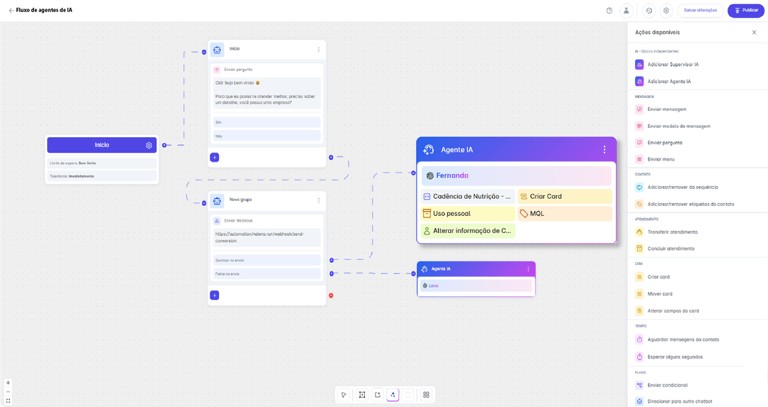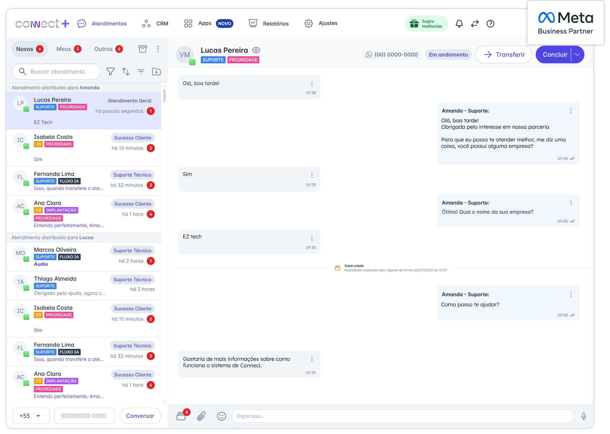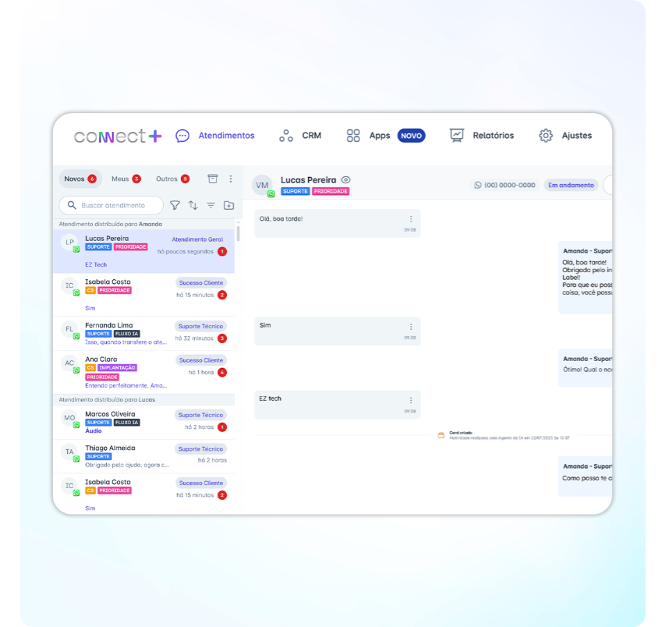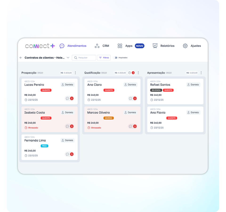 Integração com Atendimento: CRM conectado ao WhatsApp, bots e agentes humanos, sem perder contexto.